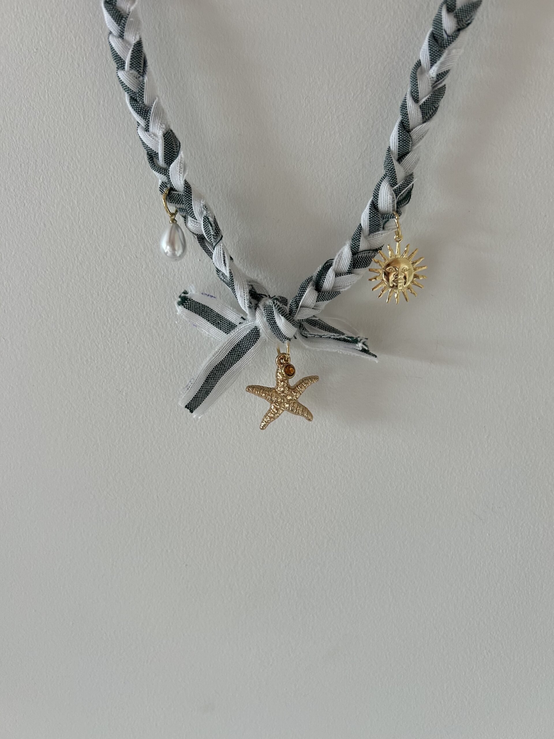 Super leuke ketting met gestreept stofje en 3 bedels
