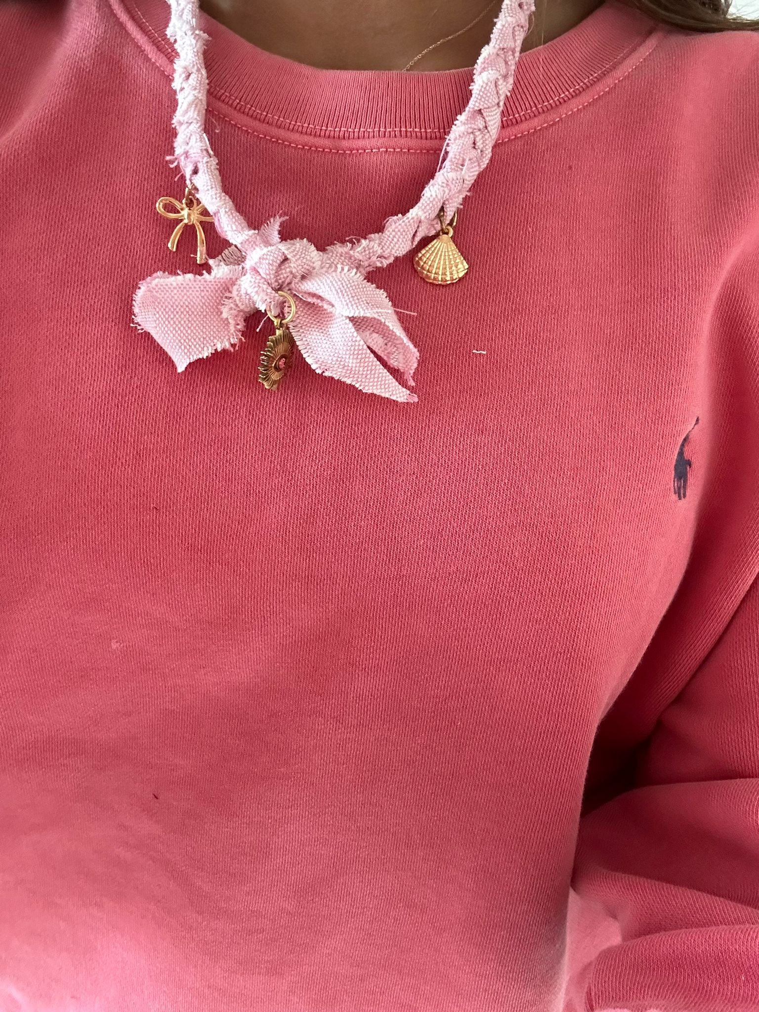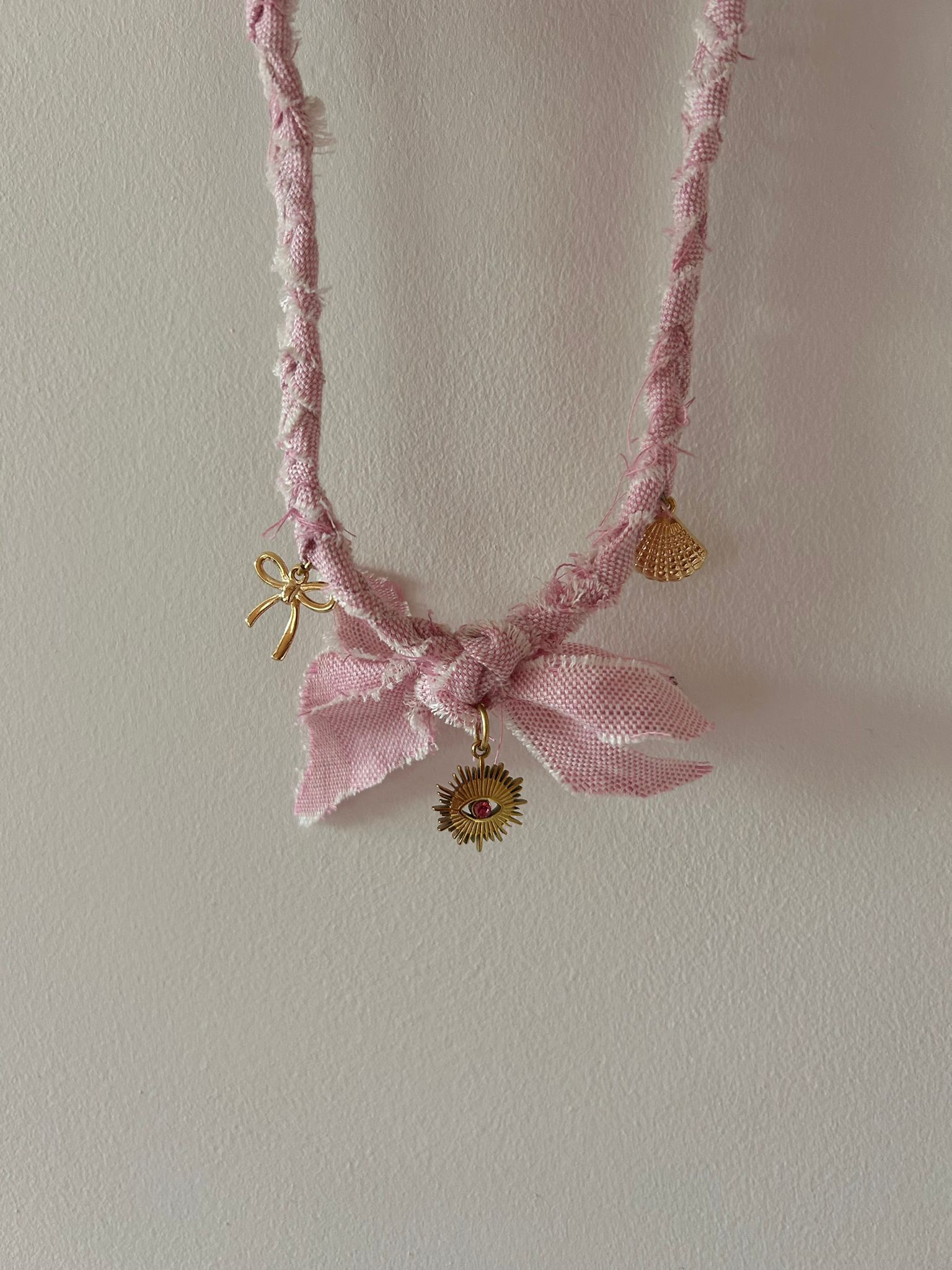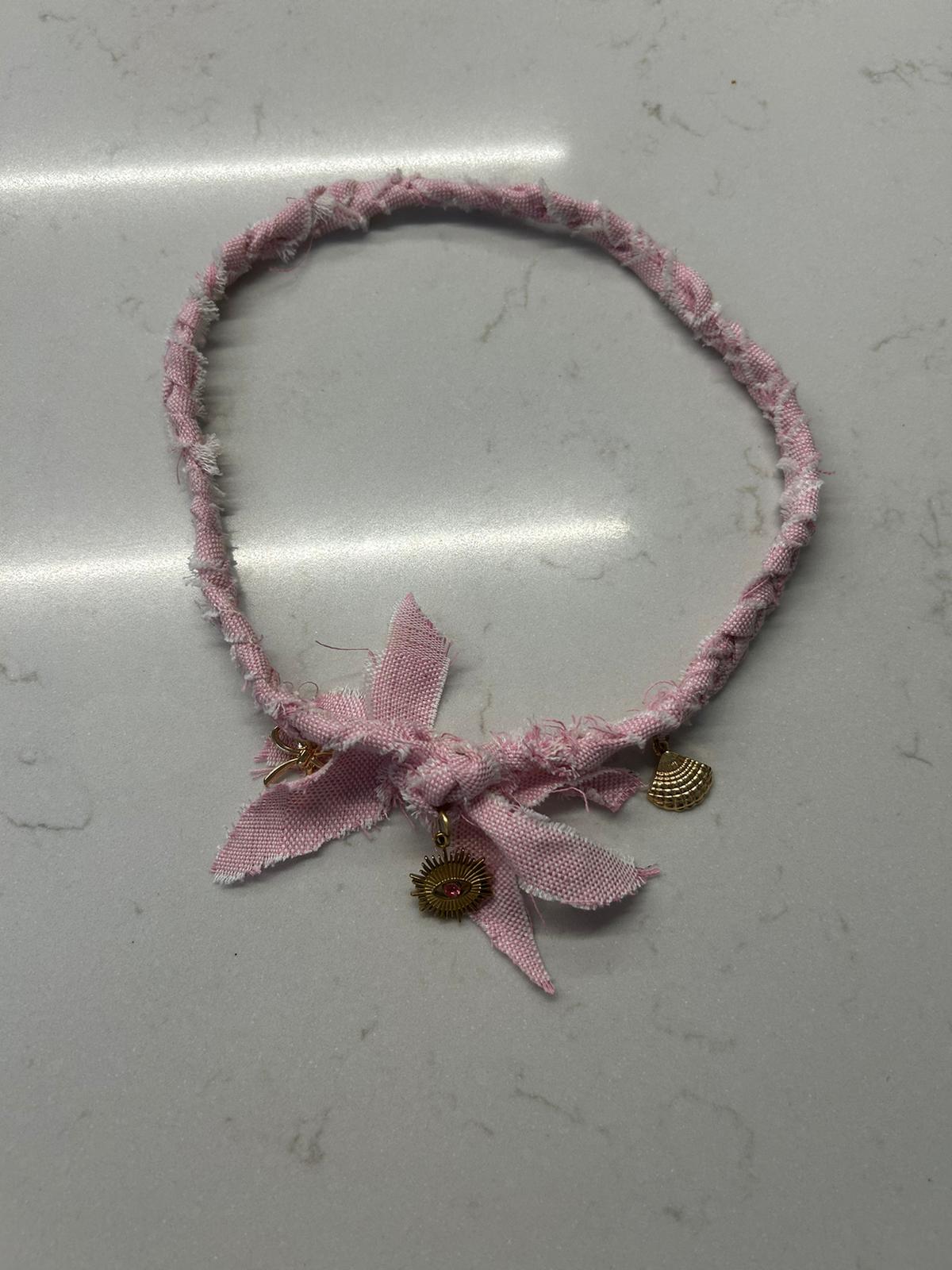Super leuke roze gevlochten ketting!! Met 3 bedels eraan.